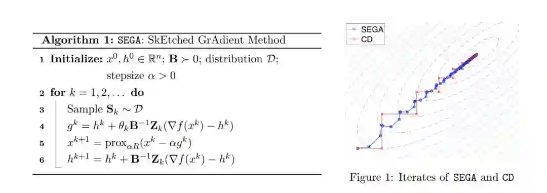 现在,读者已经熟悉了草图与投影的概念和使用方法,我们将继续探讨这篇论文的内容。作者提出了一种随机一阶优化方法——SkEtched GrAdient (SEGA),该方法通过迭代逐步建立梯度的方差缩减估计值,该估计值来自于从理想状态获得的梯度的随机线性测量(草图)。