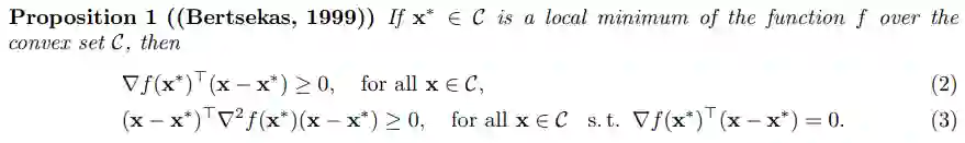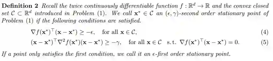 在高维空间中,鞍点控制着损失表面(详情见 Choromanska et al.,2015)。因此,我们的目标是避免算法陷入鞍点,并找到一个(ε,γ)二阶驻点(SOSP),即满足(4)和(5)的 x*。反过来,一个(ε,γ)二阶驻点(SOSP),将接近一个局部最小值,因此它是一个充分解。