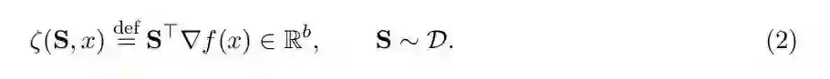 其中 f 为 R^n →R 的映射,它是平滑的凸函数,而 R(x) 是封闭的凸正则化项。作者没有假设我们可以得到真正的梯度▽f(x)。然而,假设理想状态 oracle 提供梯度的随机草图(它只是一种线性变换),我们可以用它来驱动迭代过程。具体而言,在矩阵 S∈R^(n*b)(b≥1,可以将其固定,但并不一定需要这么做)上给定一个固定的分布 D,和一个查询点 x ∈R^n,oracle 提供了算法的随机线性变换的梯度