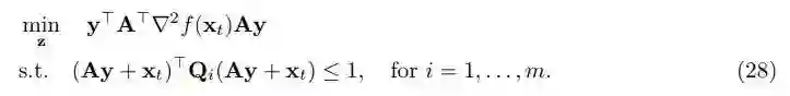 任意满足▽ f(x_t)=0 的向量 z 可以被写作 z=Ay,其中 y=(u-x_t)∈R^(d-1)。因此,(26)中的优化问题可以被写作如下形式: