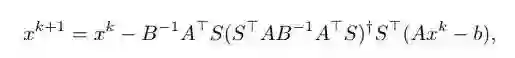 点 x* 可以通过迭代过程找到,这个迭代过程使用一系列的概要矩阵逐渐提炼出 Ax = b 的近似解,而不是用单笔草图法。令 x^k∈R^n 为我们当前对 Ax = b 的解的估计。我们可以通过将 x^k 投影到解空间上在如下所示形式描绘出的系统中改进对解的估计。