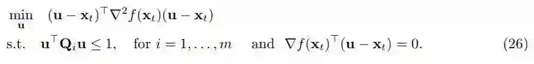 此时,算法 1 已经到达了一个 ε 一阶驻点。现在我们的目标是,如果它是一个局部极大值或一个严格鞍点,我们将使用目标函数 f 的二阶信息来跳出当前的驻点。要做到这一点,我们必须在满足 ▽ f(x_t)(u - x_t) = 0 的切线空间中找到一个可行解 u∈C,使内积 (u - x_t)^T ▽^2 f(x_t) (u - x_t) 小于 -γ。如果存在这样一个点 u,这意味着方向(u- x_t)是梯度下降的方向,我们的算法可以从当前的驻点离开。这是通过解决下面的优化问题来实现的。