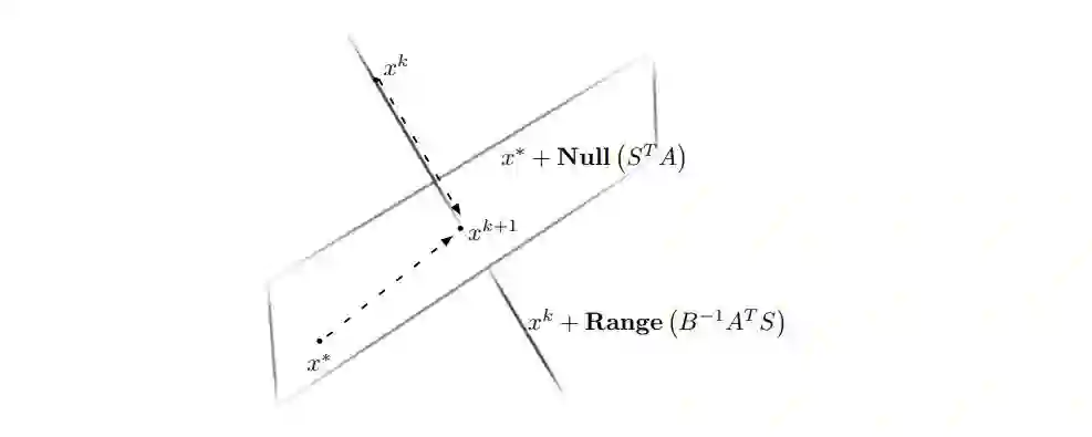 因此,我们可以看到,在下一轮迭代中,x^(k+1) 将成为两个随机仿射空间(x^{k} + Range(A^T S) 和 x* + Null(S^T A))的交点:我们可以等价地将 x^(k+1) 看成 x^k 在 x* + Null(S^TA) 上的投影。