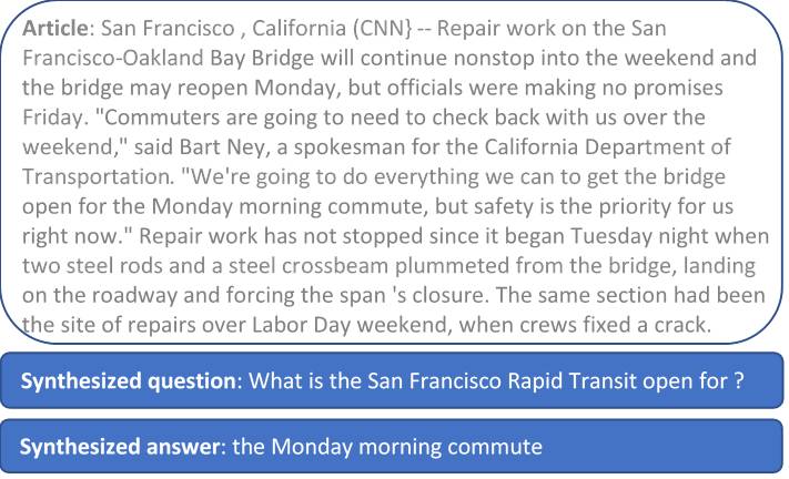 产生合成数据来对不足的训练数据进行补充,这种想法在以前就有过研究。例如,针对于翻译任务,Rico Sennrich和他的同事们在一篇论文中提出了一种方法:根据真实的句子生成新的句子,用来完善已有的机器翻译系统。然而,与机器翻译不同的是,对于像MRC这样的任务,一篇文章需要既生成问题,又生成答案。此外,即使问题在语法上是流利的自然语句,答案通常是段落中某个突出的语义概念,例如一个命名实体、一段情节或是一个数字。由于答案与问题有不同的语言结构,因此将他们视为两种不同类型的数据可能更合适。