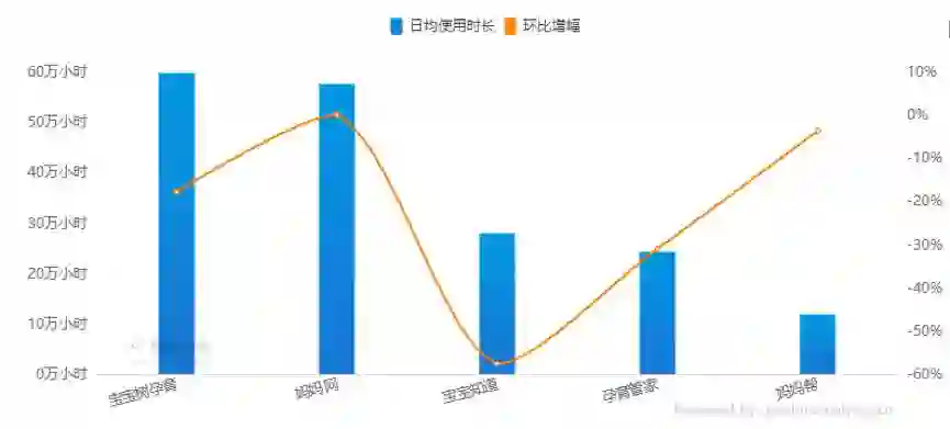 在母婴综合社区日均使用时长上,宝宝树孕育和妈妈网以绝对优势分列前两名,而除妈妈网日均使用时长略有增长外,其他头部App均出现了一定环比下降,宝宝知道更是环比下降57.6%。