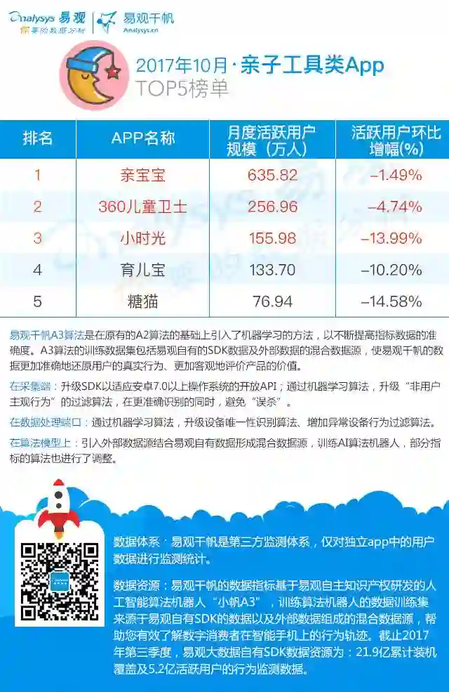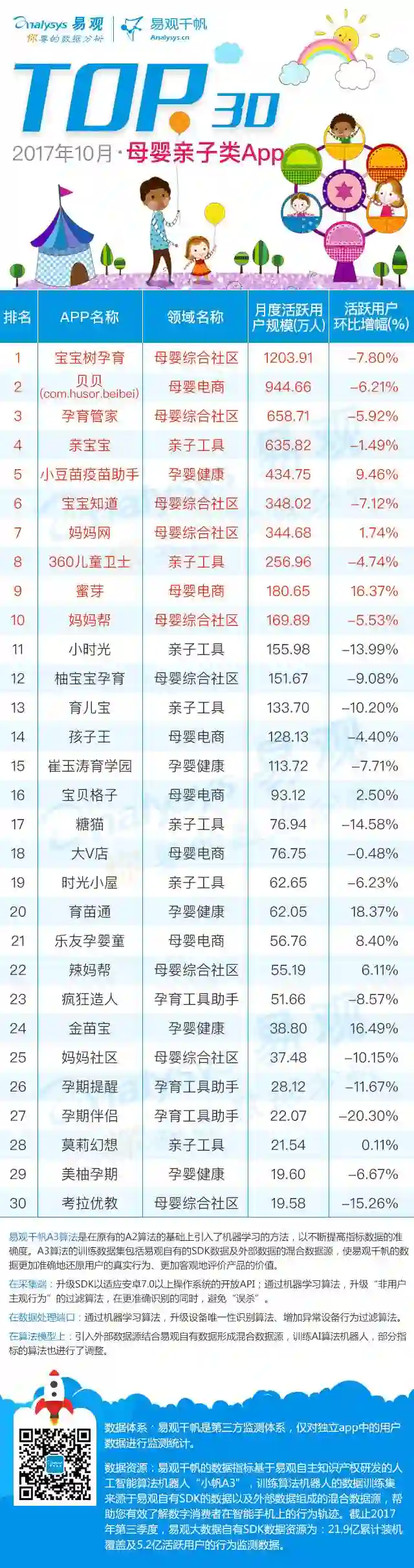 基于易观千帆10月移动应用大数据,我们从母婴亲子类App中,选取母婴综合社区与亲子工具领域运营数据独家发布,根据月度活跃用户规模、人均行为及次月留存率来编制排行榜单和分析解读。