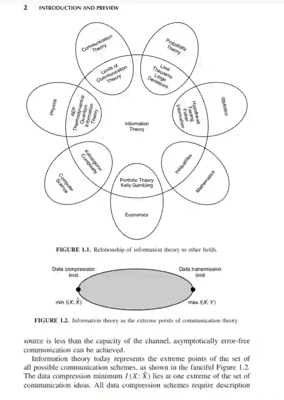 信息论中有两个简明要点。第一,熵与互信息这样的特殊量是为了解答基本问题而产生的。例如,熵是随机变量的最小描述复杂度,互信息是度量在噪声背景下的通信速率。另外,我们在以后还会提到,互信息相当于已知边信息条件下财富双倍的增长。第二,回答信息理论问邀的答案具有自然的代数结构。例如,熵具有链式法则,因而,谪和互信息也是相关的。因此,数据压缩和通信中的问题得到广泛的解释。我们都有这样的感受,当研究某个问题时,往往历经大量的代数运算推理得到了结果,但此时没有真正了解问题的全莪,最终是通过反复观察结果,才对整个问题有完整、明确的认识。所以,对一个问题的全面理解,不是靠推理,而是靠对结果的观察。要更具体地说明这一点,物理学中的牛顿三大定律和薛定谔波动方程也许是最合适的例子。谁曾预见过薛定谔波动方程后来会有如此令人敬畏的哲学解释呢?
