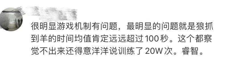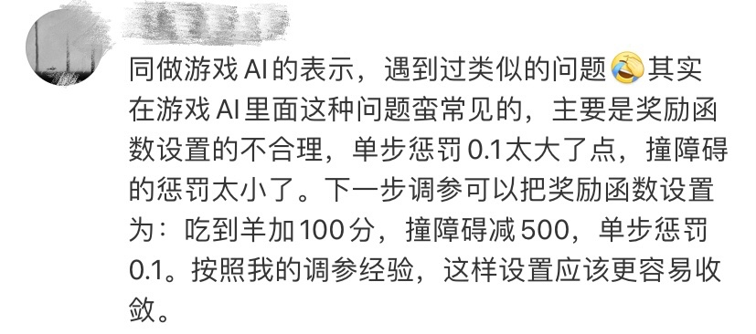还有网友认为,单步惩罚太大,而撞障碍物的惩罚太小,应该把奖励函数设置为,撞到障碍物的惩罚无穷大,那么狼就知道了撞石的代价,就不会轻易选择自杀了。