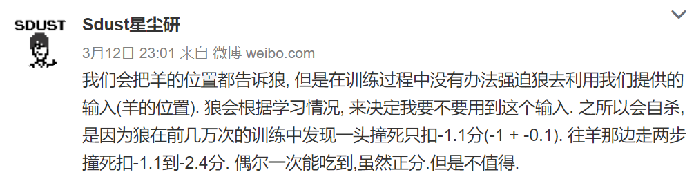 该项目的一位研究人员@Sdust星尘研表示,「之所以会自杀, 是因为狼在前几万次的训练中发现一头撞死只扣-1.1分(-1 + -0.1)。