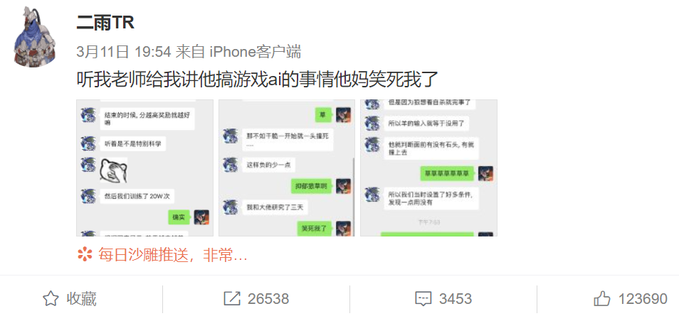 近日,微博上一位网友@二雨TR最近发文称,听我老师给我讲他搞游戏ai的事情笑死我了。