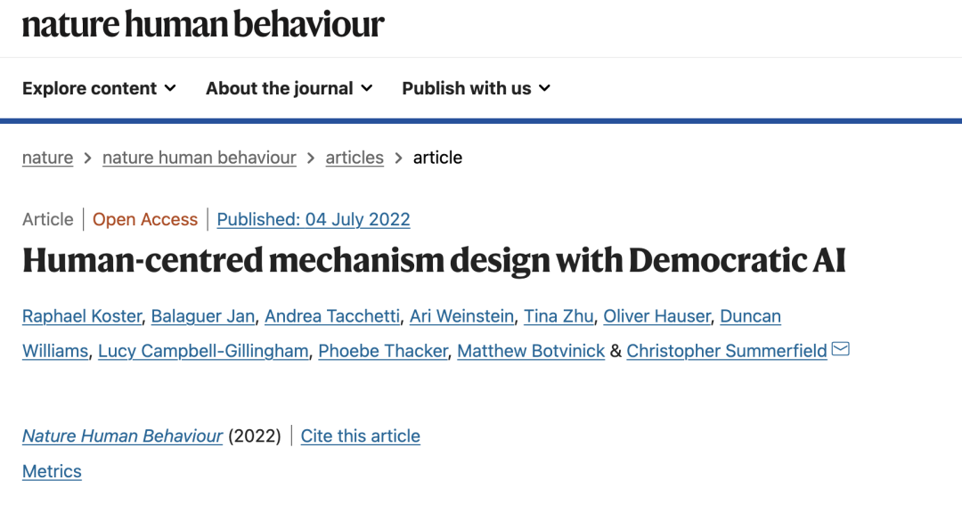 相关研究论文以「Human-centred mechanism design with Democratic AI」为题,于 7 月 5 日在线发表在权威科学期刊 Nature Human Behaviour 上。