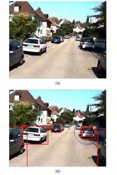 图 1.来自两个数据集的车辆检测的复杂性的图示(a)PASCAL VOC2007 汽车数据集由不同视点和较少遮挡的单车组成。(b)KITTI 车辆基准包括安装在驾驶汽车上的摄像头拍摄的道路上的汽车,该汽车具有更多的遮挡和截断。
