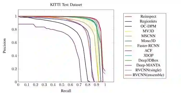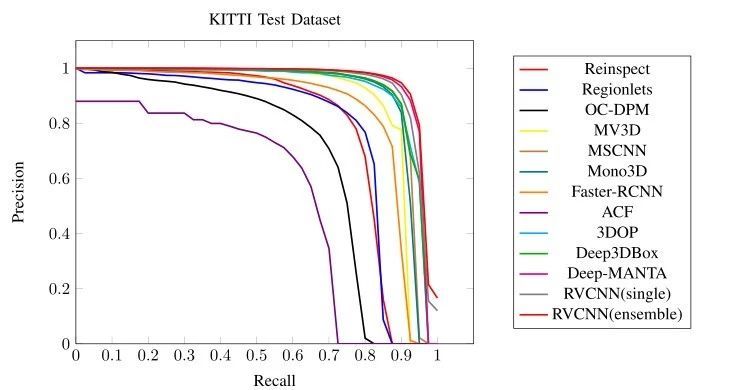 为了与 KITTI 检测基准的最新方法进行比较,我们使用所有 KITTI 训练数据训练我们的 RPN 和 RV-CNN,然后将我们的结果提交到官方网站,在 KITTI 测试集上测试我们的方法。
