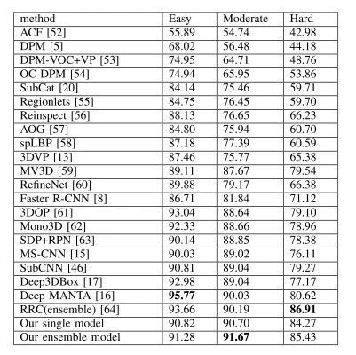 表 2 列出了三类检测结果,我们将我们的方法(RV-CNN)与 KITTI 评估的不同方法进行了比较。这些结果是在 2017 年 3 月提取的。最近,评估脚本已经更改,并提供了原始结果。我们的方法在基于中等难度结果的所有已发布方法中排名第一。实验结果证明了我们的 CNN 能够处理具有更多遮挡和截断的车辆。图 7 给出了中等类别的 KITTI 测试装置的精确召回曲线。