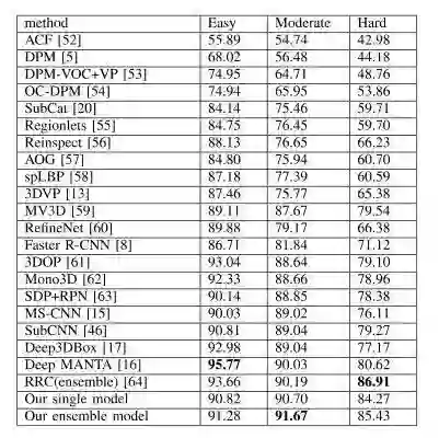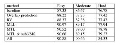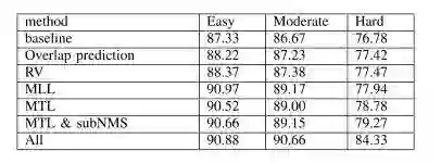 我们根据 KITTI 基准 [2] 建议,在三个难度级别(简单,适度和难度)上评估我们的识别结果。为了评估物体检测精度,在整个实验中报告平均精度(AP)。