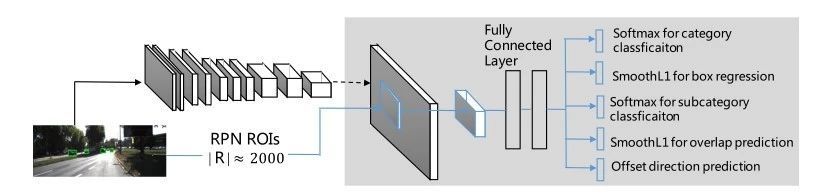 最近,多任务学习已经应用于许多计算机视觉问题,特别是在缺乏训练样本的情况下 [12]。多任务学习的目的是在同时解决多个相关任务的同时,加强信息共享。这种共享已经被证明可以提高部分或全部任务的性能 [12],[47],[48]。对于车辆检测问题,我们通过子类别,区域重叠,边界框回归和每个训练 RoI 的类别作为多任务学习框架,丰富了监督信息。接下来,我们将详细解释多任务 CNN 模型的提议方法的细节。图 2 显示了所提出的多任务学习框架的总体流程。如图 2 所示,在生成 RoI 之后,我们将 [29] 中提出的 RoI 池化层应用于每个 RoI 的池卷积特征。然后,汇集的卷积特征用于完成四个任务:类别分类,边界框回归,重叠预测和子类别分类。最后一部分「偏移方向预测」将在下一节中描述。每个被训练的 RoI 都标有真实类和真实边界框回归目标,类似于 [29] 中的设置。通常,该监督信息用于设计分类损失 L cat 和边界框回归损失 L loc。