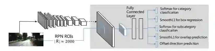 大多数这些深度模型都针对一般物体检测。为了更好地处理被遮挡车辆的检测问题,在 [38] 中的一个 DPM 模型提供的根和组件分数配置上使用了第二层条件随机场(CRF)。最近,在 [39] 和 [40] 中提出了一个和或结构,以有效地将遮挡配置与经典的 DPM 进行比较。在 [41] 中,作者建议将车辆检测和属性注释结合起来。此外,改进模型泛化的一种常见方法是学习对象类 [20] 中的子类别。子类别已被广泛应用于车辆检测,并提出了几种子类别分类方法 [42-45]。在 [42] 中,使用局部线性嵌入和 HOG 特征以无监督的方式学习学习对应于车辆方向的视觉子类别。参考文献 [43] 根据对象的视角执行聚类,以发现子类别。在 [45] 中研究了区分性子分类,其中聚类步骤考虑了负面实例。最近,[13] 提出了一种新的对象表示,即三维体素模式(3DVP),它共同编码对象的关键属性,包括外观、三维形状、视点、遮挡和截断。该方法以数据驱动的方式发现 3DVPS,并为 3DVPS 训练一组专门的检测器。在 [46] 中,作者利用 3DVP 子类别信息训练子类别卷积层,输出特定位置和比例下某些子类别存在的热图。在我们的工作中,我们将子类别分类作为改进基于 CNN 的检测性能的多任务的一部分,并且可以使用在 [13]、[42] 和 [43] 中获得的子类别标签来实现该组件。