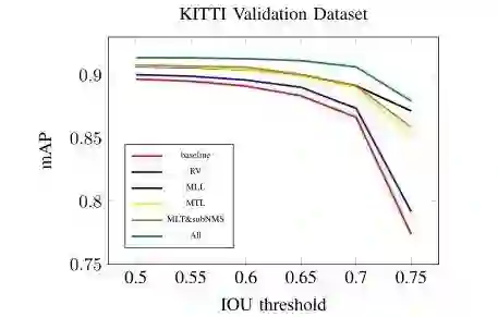 汽车的 KITTI 基准采用 0.7 重叠阈值。表 I 显示了三个类别的检测结果,其中我们证明了各种组分对 KITTI 的 RV-CNN 性能的影响。从表 I 可以看出,多任务学习,RoI 投票和多层次本地化的组成部分都是有效的设计。对于那些中等和难度级别的汽车,我们的方法可以通过更多组件实现更好的性能。