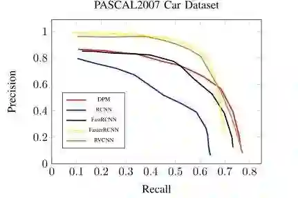 我们已经在两个常用的车辆检测数据集(KITTI 车辆基准 [2] 和 PASCAL VOC2007 汽车数据集 [1])上评估了我们的方法。我们的方法在 KITTI 车辆检测基准上实现了 91.67% 的 Ap,显著超越了最近的结果 [15-17]。此外,我们还对 PASCAL VOC2007 汽车数据集进行了实验。实验结果表明,与基线和相关方法相比,我们的 RV-CNN 模型具有了一致且显着的性能提升。