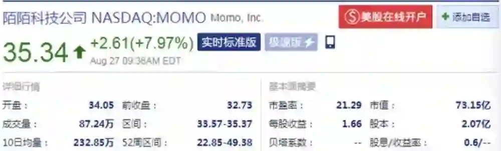 @新浪科技【陌陌盘中大涨近8%,报35.34美元】陌陌昨晚公布了2019年第二季度未经审计财报。财报显示,2019年第二季度,陌陌净营收达41.526亿元(约6.049亿美元),同比增长32%。不按照美国通用会计准则计量,2019年二季度归属于陌陌母公司的净利润为12.425亿元(约1.810亿美元)。截至北京时间昨晚21:36,涨幅近8%,报35.34美元。