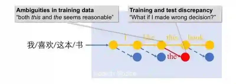 训练数据歧义性:在我们的翻译的例子里,”这“可以翻译this也可以翻译为the,但训练数据往往只有一种参考翻译。