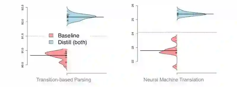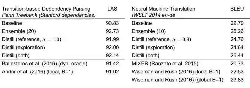 我们在基于转移的句法分析以及一个小规模机器翻译数据集上进行了实验。实验结果如表1所示。相较基线模型,我们的蒸馏模型在不改变模型结构的情况下将句法分析的准确率提高1.3,并将机器翻译准确率提高2.6。
