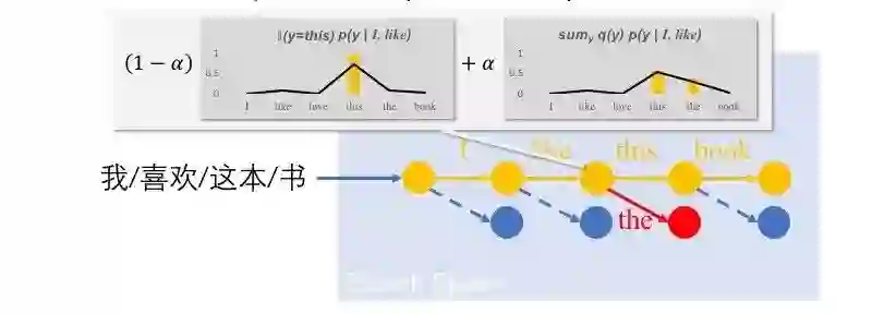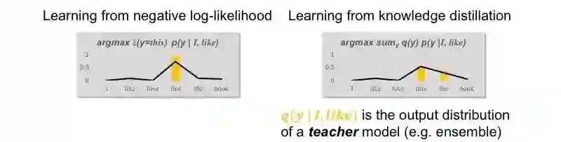 知识蒸馏[Hinton et al., 2015]是一种机器学习算法。不同于传统的从训练数据中有监督地学习,知识蒸馏从一个复杂模型(teacher model)的概率输出中学习参数。图4给出了知识蒸馏的学习目标,以及和对数似然学习目标的对比。当然,两种学习目标可以通过插值简单组合。