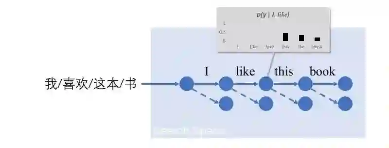 一种求解这些多变量的方法是将求解过程建模为一个搜索过程。我们从起始状态出发,每次选择一个搜索动作(对于机器翻译来讲,可以认为从词表中选一个词作为翻译是一个搜索动作),进入新的状态。不断重复这一过程,就可以获得最终的结构(如图2所示)。