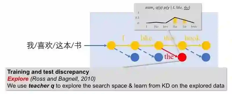 对于训练测试不一致的问题,前人研究的主要解决思路是在训练过程中引入错误状态并在错误状态上进行模型学习。在这项工作中,我们也沿用了这一思路,用模型集成随机地探索状态空间,并在探索到的状态上使用知识蒸馏目标学习模型参数(如图6所示)。由于这种知识蒸馏方法在探索得到的状态(explored state)上进行知识蒸馏,我们将其命名为distilling from exploration。