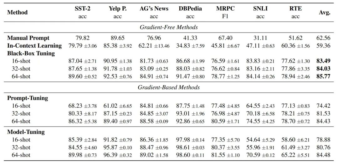 但无梯度方法本质上还是基于搜索的,即使对于 parameter-efficient tuning 也还是会有上万的参数量需要优化(例如 prompt tuning 优化 20 个 token,每个 token 1024 维,总共是 20480 维),这让非梯度优化很难做。