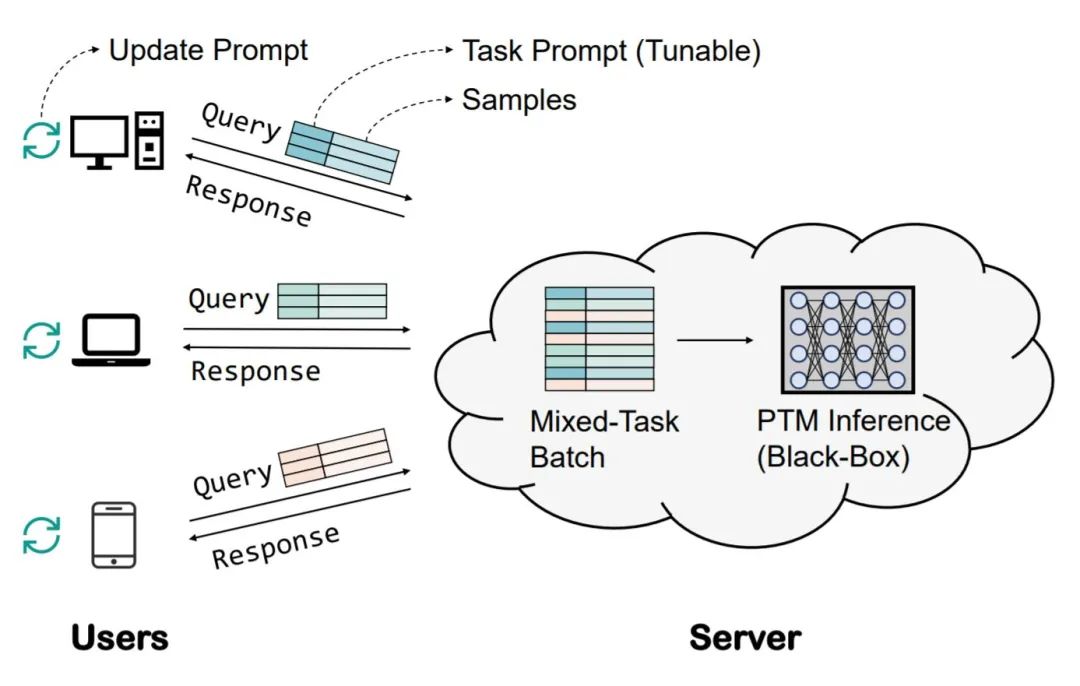 为了做到大模型的高效部署,我们可以诉诸于 parameter-efficient tuning,即只 fine-tune 少量参数,如 adapter 和 prompt tuning,但仍然需要调参师傅在服务端帮你 tuning。自然地,我们想到可以让用户根据推理 API 的返回结果自己优化 adapter 或 prompt,比如用无梯度优化(Derivative-Free Optimization)去优化这些 “少量” 的参数。基于这个朴素的想法,我们有了下面的一张愿景图: