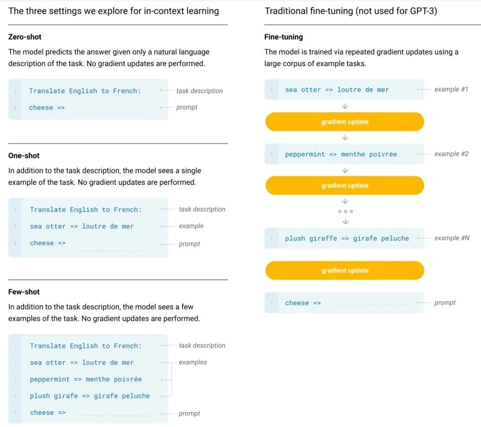 但大模型的预训练成本和 Fine-tuning 成本都是比较昂贵的,并且现在很多大模型出于成本和商业考虑都不再开源参数,因此大模型得有大模型的玩法。作为大模型的开路先锋,GPT-3 在他们的论文里给出的玩法就是 in-context learning. 如下图所示,不需要进行反向传播,仅需要把少量标注样本放在输入文本的上下文中即可诱导 GPT-3 输出答案。