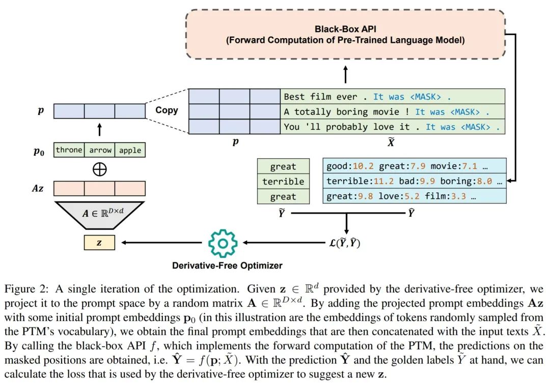 基于以上,我们大概可以得知,结合 parameter-efficient tuning 和基于 random embedding 的非梯度优化算法,就可以做到前文提到的使用推理 API 把下游任务做好(开除调参师傅)的愿景。下面我们给出了 black-box tuning 的一个具体实现,比较懒,请大家读 caption.