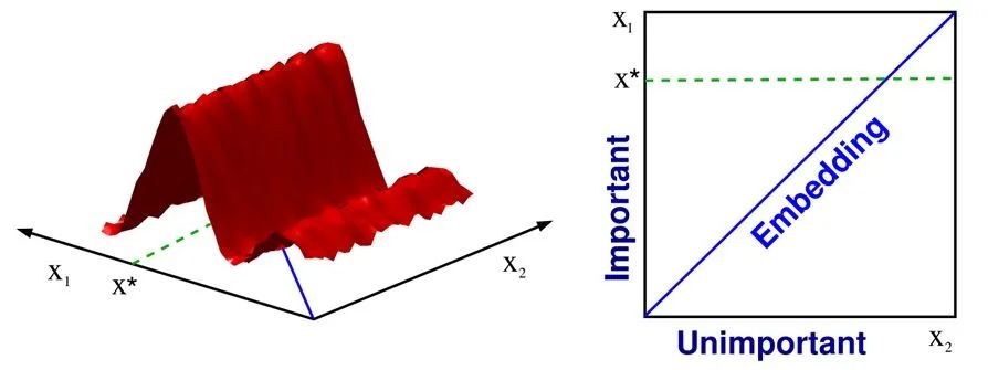 在非梯度优化中,如果要优化的目标函数原本维度很高,但只要本征维度很小,我们就可以使用非梯度优化方法来做,一种方法就是通过 random embedding. 例如在下图中,左边的目标函数是二维的,但其函数值实际上只跟一个参数( [x_1] )相关,那么我们就可以使用一个 random embedding 将要优化的参数映射到一低维子空间(如下图右边的 embedding 就是 [x_1=x_2] ),在这一子空间中进行优化便可以找到最优解 [x^*] .