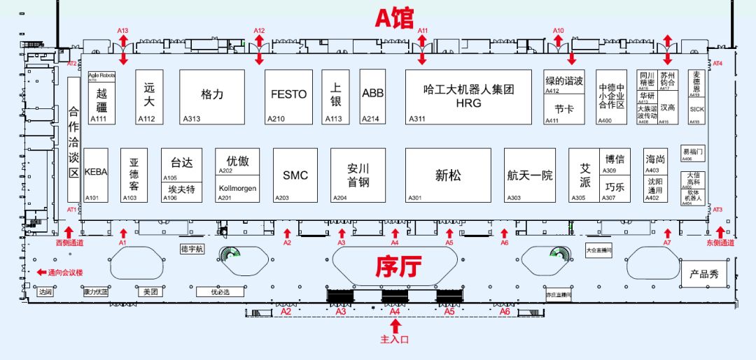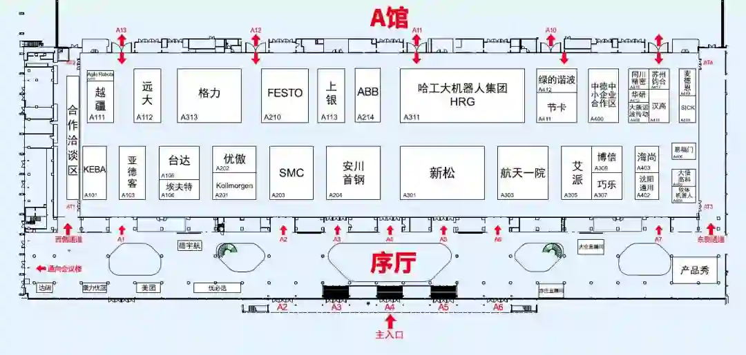 A馆为工业机器人及核心零部件展区,展示了新松、格力、拓斯达、ABB、FESTO、优傲、绿的谐波、科尔摩根等企业焊接、搬运、装配、打磨抛光、码垛、锻压、上下料等机器人本体,以及减速机、伺服电机、控制器等核心零部件,共计200余件(套)展品。