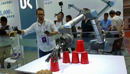 对面优傲的展示人员戴上特殊手套,站在一米开外,上演着“隔空取物”,将一个个杯子整整齐齐码好。