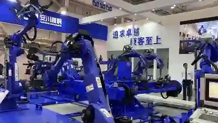 对面的安川首钢展位,则摆放了一套完整的智能化机器人弧焊生产线,机器人互相协作有条不紊的工作。