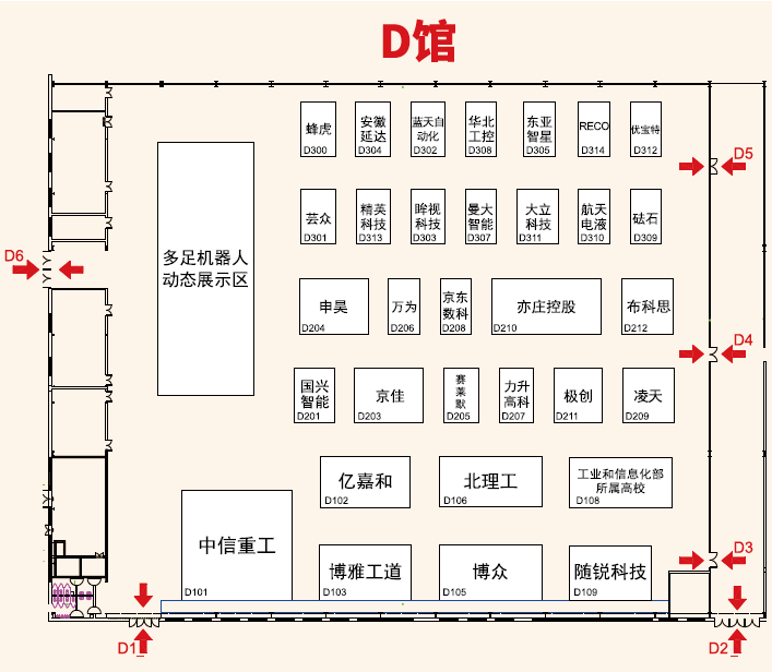 D馆为特种机器人展区,中信重工、博雅工道、亿嘉和、博众、国兴智能、凌天科技等特种机器人企业展示了安防机器人、排爆机器人、消防机器人、农业机器人、水下机器人等领域的实际应用,共计100余件(套)展品。