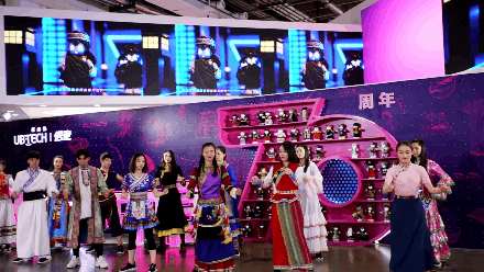 “悟空”机器人,穿着56个民族的服饰,跟工作人员一起舞动。