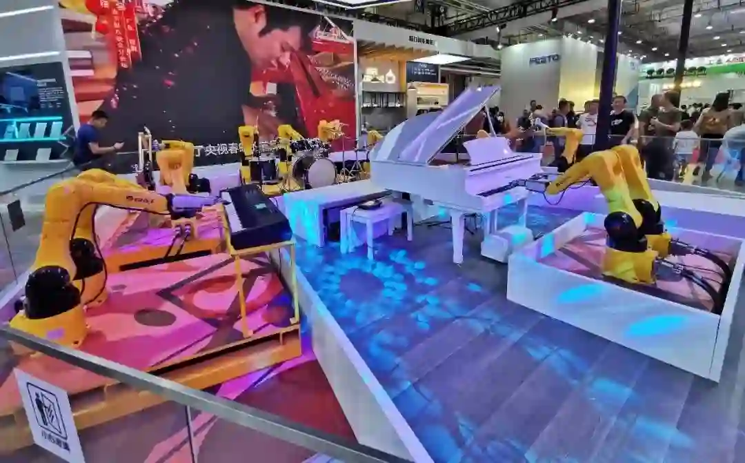 格力机器人乐队现场弹奏《五星红旗迎风飘扬》,演绎“乐队的夏天”,赢得满堂喝彩。