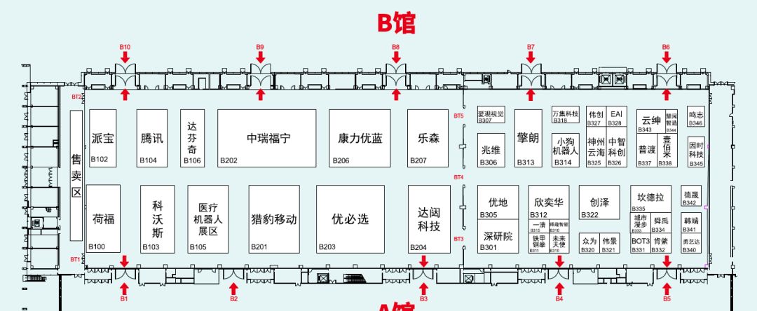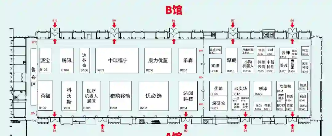 B馆为服务机器人展区,展示了优必选、irobot、科沃斯、猎豹移动、康力优蓝、达闼科技、优地科技、擎朗、中瑞福宁、达芬奇等服务机器人企业商用机器人、家用机器人、健康养老机器人、教育机器人、医疗机器人等300余件(套)展品。