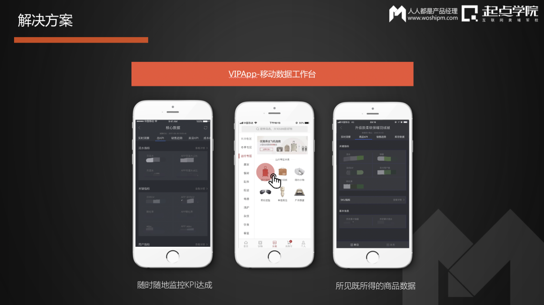 针对CXO的看数场景和需求(痛点),我们设计开发了VIPApp-移动数据工作台。VIPApp为CXO提供了随时随地监控KPI以及所见既所得商品、类目、流量数据。下图中是VIPApp很早期版本的一些UI,因为数据安全的原因数据部分打了码。早期VIPApp主要为CXO及少数中高层服务,现在已经逐渐发展成面向严选全员的移动数据工作台了,承载了整个严选KPI体系监控及各业务运营的数据监控体系。VIPApp从技术角度看是以严选app为容器,内嵌了一个wap(数据产品)网站;从用户角度看依托严选app提供了所见既所得的交互入口。用户可以长按类目唤起类目数据页,长按商品唤起商品数据页,长按流量位置唤起流量数据页。移动化让用户随时随地可以查看数据,所见既所得的入口让用户可以快速找到对应的数据模块。好的用户体验一定会带来高频访问的回报(每个产品人都应该信仰),VIPApp也不另外,是我们最成功的数据产品。