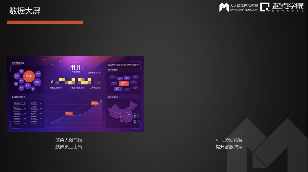 针对电商大促场景化数据需求,我们设计开发了电商数据大屏和客服数据大屏。在17年双11之前,我们开发了第一版严选电商双11数据大屏。跟业界双11数据大屏类似,数据大屏通过主动的实时数据呈现,让业务实时追踪大促爆发。通过炫酷的视觉样式和动画来渲染大促氛围。在电商双11大屏上线后,我们客服部门负责人找到我们,希望帮他们在下一次大促前做个客服数据大屏。由于没找到mock数据的客服数据大屏(下图的大促数据大屏数据是mock的),且客服数据大屏上数据太多打码难度太大,大家根据大促数据大屏自行脑补下UI吧。客服数据大屏包含实时的会话、排队、坐席数据,还有满意度、CPD、满意度报警、超30分钟会话等排行榜。我们发现电商数据大屏只在双11、周年庆等极少数电商大促节日的正点时段使用,但是客服数据大屏在我们两地的客服部门长期放了好几块。这种现象让我想到在房产中介看到的月度榜单墙,客服大屏是一种更实时的可视化的劳动竞赛榜。