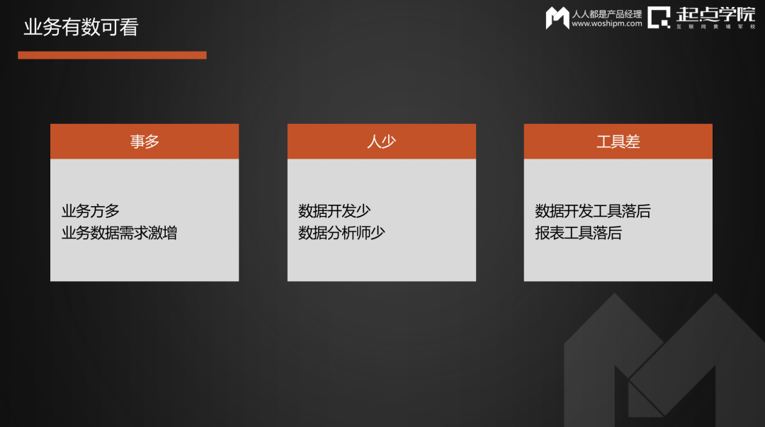 2017年,我刚来严选的时候,是严选数据产品起步的阶段,我们主要面临事多、人少、工具差的三大问题(应该也是各个数据部门长期面临的问题)。