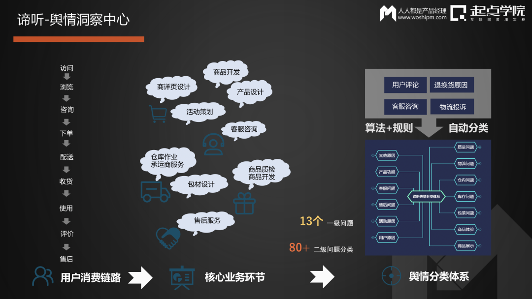 针对用户体验场景化需求,我们设计开发了谛听-舆情洞察中心。用户体验的难点在于难以定量的衡量和分析。除了复购、退货量这些间接的量化指标外,我们能收集到的用户直接的声音是用户评论、客服咨询等非结构化、定性的数据。用户在严选的消费链路(访问->浏览->咨询->...)的每个节点,在严选内部都有对应的业务部门/业务环节为用户提供服务。我们根据业务环节建立舆情的分类体系,通过算法+规则将舆情分到对应分类中。将归属到具体分类的舆情数量求和,就完成了舆情从定性到定量的过程,舆情类别就是舆情分析的维度。因为我们建立了用户舆情->舆情分类->业务环节(部门)的映射关系,就可以通过分析对应业务部门所属分类的数据来评估对应部门的用户体验,进而可以将对应的负面舆情分发到对应的部门进行改进。质量相关的舆情我们早已完成线上评估->分类->分发->改进的线上化闭环,当前我们也正在推进其他分类的线上化闭环。