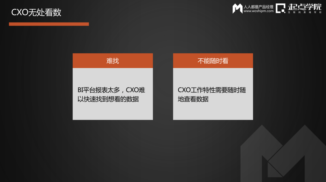 看到“CXO无处看数”,大家可能觉得很奇怪。上文不是说了,在有数上已经制作了大量报表,怎么CXO会无处看数。因为CXO有不一样的场景,进而产生不一样的需求。尽管BI平台(严选有数)上有大量报表,CXO依然面临“难找”、“不能随时看”的问题。CXO有整个BI平台的权限,进入平台后面对海量的报表,难以快速找到想看的数据(CXO的时间又很少)。CXO工作特性需要随时随地查看数据。CXO事情特别多,电商CXO尤甚,品牌电商CXO更甚,CXO不是在开会/出差,就是在开会/出差的路上(连我自己现在也差不多)。