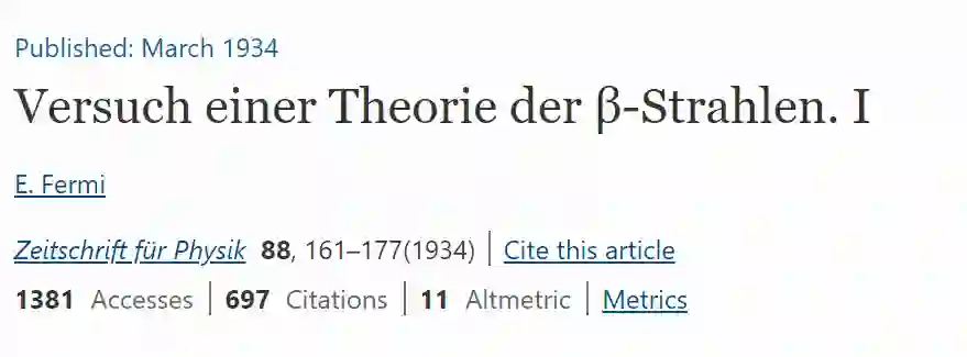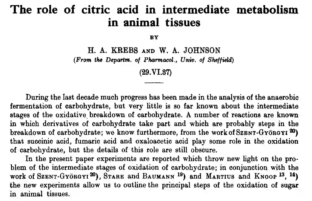一起看看! 1. 玻色—爱因斯坦统计和凝聚,1924 论文:普朗克定律和光量子假设 (Plancks Gesetz und Lichtquantenhypothese) 作者:Bose, S. 期刊:《物理化学杂志-国际物理化学研究期刊》(Z. Physik) 摘要:玻色的论文,在这里被翻译成葡萄牙语,用爱因斯坦的话说是“到目前为止,这是一个重要的进步”。 关注光的量子理论的发展。虽然没有明确声明,但玻色认为,光量子(light quanta)是难以辨别的。 此外,他承认当时物理学界没有广泛接受的假设,即光子携带动量。他的论文启发了爱因斯坦在接下来的他的气体量子理论思路。 准确来说,整数自旋粒子的量子统计,与正文的玻色-爱因斯坦统计学是已知的。 1923年末,玻色向《哲学》提交了这篇论文。六个月后,期刊编辑告诉他,很遗憾评审给他的论文的反馈是负面的。 但他没有因此受到打击,将被拒绝的手稿寄给了爱因斯坦,后面的事情大家都知道了,爱因斯坦对这篇很感兴趣,并亲自将这篇收稿翻译后发表在Z. Physik期刊上,写道:“在我看来,这是向前迈出的重要一步”。 该篇论文主要是在普朗克的研究基础上,玻色引入了一个全新的统计方法,将两个硬币向上抛起,会得到正反、反正、反反、正正,也就是说两个硬币同时朝上的面相同的概率为1/4。 然而玻色提出全同(占据量子态)的光子是没有正反和反正的区别,所以只会有三种状态:正反、反反、正正。而该概率则下降成1/3。 参考链接:https://tu-dresden.de/mn/physik/itp/tqo/ressourcen/dateien/lehre_dir/vorlesungen_dir/ws_2012_2013/folder-2012-12-21-5820555304/bose_1924.pdf?lang=de 2. 弱相互作用(β衰减),1933 论文:关于β辐射理论的尝试 (An attempt of a theory of beta radiation) 作者:Enrico Fermi 期刊:《物理化学杂志-国际物理化学研究期刊》(Z. phys)摘要:本文提出了一种β衰变的定量理论,其中假设了中微子的存在,并用类似于辐射理论中从激发原子发射量子光的方法,来处理β衰变时原子核的电子和中微子的发射,推导了连续β辐射谱的寿命和形状公式,并与以往经验进行了比较。 费米相互作用(Fermi’s interaction):关于弱相互作用的早期理论,把弱相互作用看做是一种参与作用的四个粒子(如中子衰变中的中子、质子、电子和中微子)之间的点相互作用。 《自然》的编辑称,论文存在与现实相距太远的猜想,而使读者不感兴趣。 费米在1926年曾提出费米统计理论,与前文的玻色-爱因斯坦统计的玻色子理论正好相反,根据Ricerca Scientifica, 1933年(也是Z. Phys。1934年)的“ Tentativo di una teoria dei raggiß” 提出了一种关于ß射线发射的理论。 该理论基于保利首先提出的关于中微子存在的假设,费米因其在中子产生的人工放射性以及慢中子引起的核反应方面的研究工作而获得1938年的诺贝尔物理学奖。 在罗马的职业生涯的早期,他致力于解决电动力学问题以及对各种光谱现象的理论研究。 但是,当他将注意力从外部电子转移到原子核本身时,一个资本性转折点出现了。1934年,他发展了ß衰变理论,并结合了Pauli的中微子思想与辐射理论相结合。 居里和乔利奥特(Curie and Joliot)于1934年发现了人工放射性之后,他证明了核转化几乎发生在受到中子轰击的每个元素中。这项工作导致在同一年发现了慢中子,从而导致了核裂变的发现以及元素周期表以外元素的产生。 1938年,费米无疑是最出色的中子专家,他到达美国后继续从事这一主题的研究,不久他被任命为纽约哥伦比亚大学的物理学教授(1939-1942年)。 参考链接:https://en.wikipedia.org/wiki/Fermi's_interaction#History_of_initial_rejection_and_later_publicationhttps://www.nobelprize.org/prizes/physics/1938/fermi/biographical/ 3. 克雷布斯循环(克氏循环),1937 论文:柠檬酸在动物组织中间代谢中的作用(The role of citric acid in intermediate metabolism in animal tissues) 作者:Krebs, H, Johnson, WA 期刊:《酶学》(Enzymologia)摘要:在本文发表的前十年间碳水化合物的厌氧发酵分析已经取得了很大的进展,但当时人们对碳水化合物的氧化分解的中间阶段仍知之甚少。 本文报道了一些实验,为碳水化合物氧化的中间阶段问题提供了新的思路。结合前人已完成的工作,新实验使我们能够概述动物组织中糖氧化的主要步骤。 Hans Krebs称,他的论文在五天后就被《自然》退稿了,还附了一封当时很正式的拒绝信。 这是他发表了五十多篇论文之后,职业生涯中第一次被拒。在《酶学》发表克雷布斯论文的前一年,《自然》发表了对《酶学》的欢迎语,称《酶学》正是其当下非常关注的! 在1918年至1923年之间,他在哥廷根大学,弗赖堡-布雷斯高大学和柏林大学学习医学。在柏林大学第三医学诊所工作一年后,他于1925年在汉堡大学获得医学博士学位,然后在柏林学习了一年的化学。 1933年6月应弗雷德里克·高兰·霍普金斯爵士的邀请,他去了剑桥生物化学学院,直到1934年,他被任命为剑桥大学生物化学助理研究员。 1938年,他被任命为谢菲尔德大学生物化学系的讲师。1954年,他被任命为牛津大学惠特利生物化学教授,医学研究理事会细胞代谢研究部门被转移到牛津。 克雷布斯教授的研究主要涉及中间代谢的各个方面。他研究的主题包括哺乳动物肝脏中尿素的合成,鸟类中尿酸和嘌呤碱的合成,食品氧化的中间阶段,电解质的主动转运机制以及细胞呼吸之间的关系。并生成多磷酸腺苷。 在他的许多出版物中,有一篇关于生命物质能量转换的杰出研究报告,于1957年与HL Kornberg合作出版,探