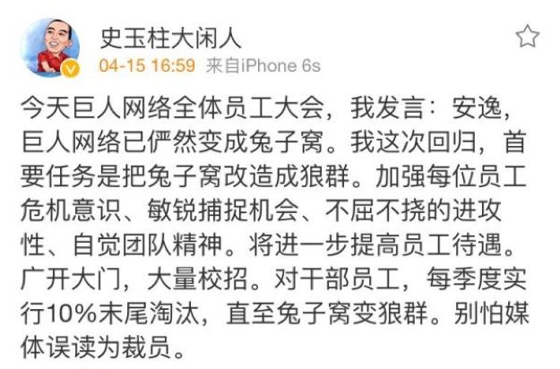 大概2年前吧,巨人网络的史玉柱折腾了一出戏:向马云取经要搞狼性文化,整团队里的兔子。落地的政策很传统——末尾淘汰。