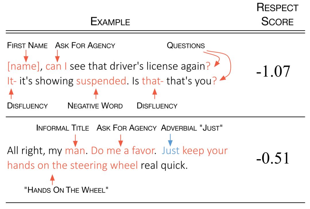 ▲ 图3. Voigt et al. PNAS 2017中Dan Jurafsky的实验室与斯坦福大学心理系合作,利用自然语言处理方法,自动评估警察对不同种族的人说话时的尊重程度。