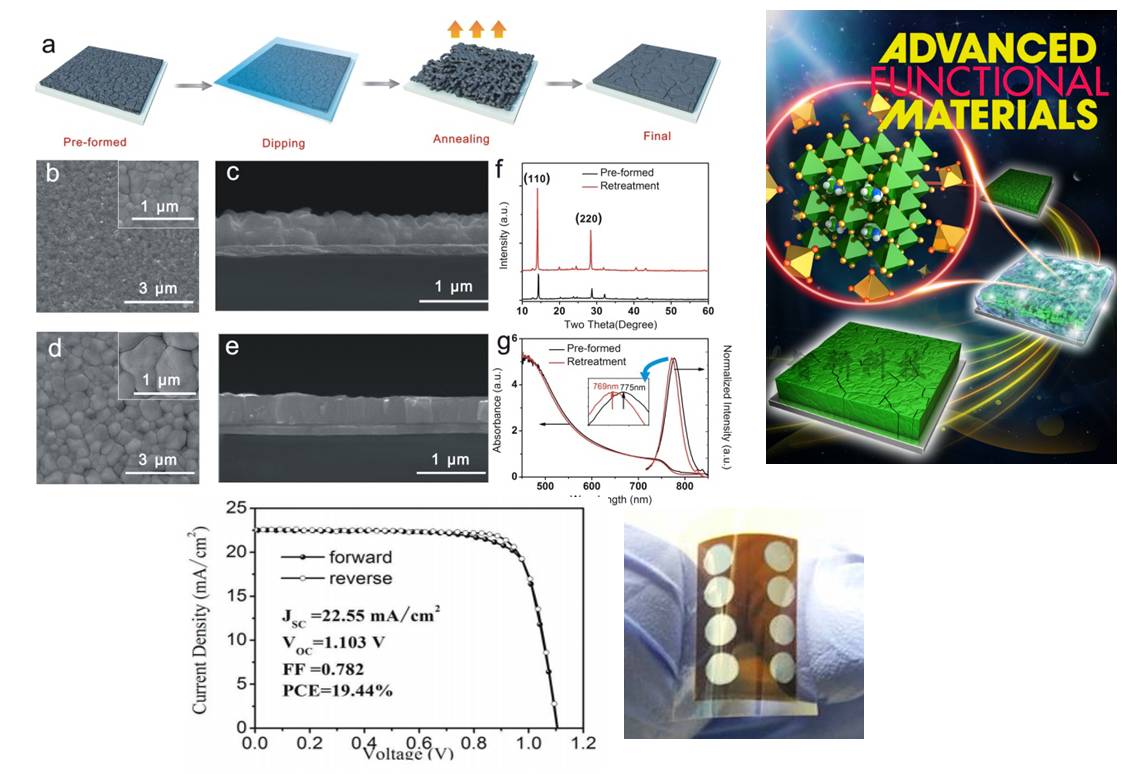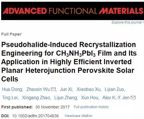 通过旋涂制备好钙钛矿薄膜后,使用硫氰酸铵(NH4SCN)后处理,钙钛矿薄膜经过分解,再重新结晶的过程,形成了晶粒更大,结晶性更好,缺陷更少的钙钛矿薄膜。这项研究工作于2017年11月发表在国际重要期刊Advanced Functional Materials(影响因子12.12)。题目“类卤素诱导的CH3NH3PbI3薄膜的重结晶工程及其在高效反型平面异质结钙钛矿太阳能电池中的应用”。第一作者为课题组青年教师董化博士(交大为第一作者单位与通讯作者单位),文章被推荐为当期的封底文章。